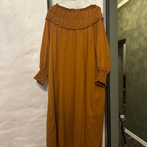 Kjole relaxmodell passer str 36-40 det er et kvalitetstoff men jeg vet ikke hva det heter. Den er kun brukt 1 time jeg selger billig pga flytting