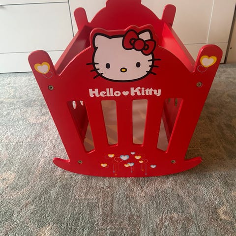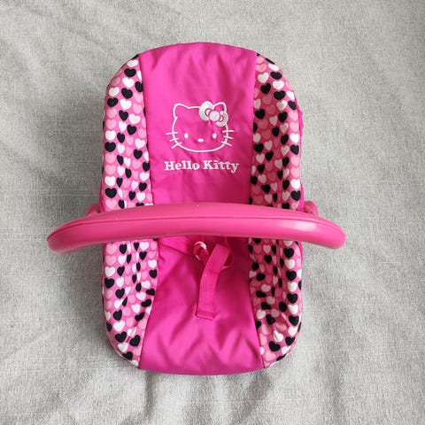 Hello Kitty dukkevogn i rosa farge med hvite prikker og blomster. Med bærebag.