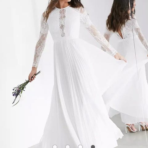 ASOS kjole i størrelse UK 10 for kvinner. Kjolen har lys lilla farge og detaljer i blonder på ermer og overdel. Den har en elegant og flytende passform med åpning I ryggen.