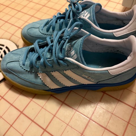 Adidas fotballsko i størrelse 43. Skoene har en sølvfarget overflate med svarte detaljer.