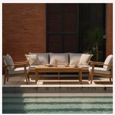 Utemöbelsett i lys brunbeiset tre med beige puter