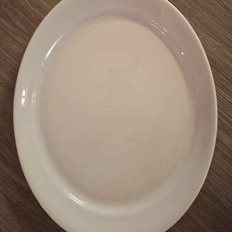 Stort og flott serveringsfat fra Porsgrund, 32 cm i diameter, i hvitt porselen med bred brun håndmalt bord og mørk blå ring mot speilet.