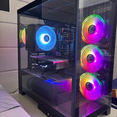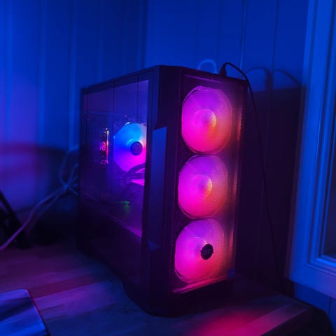 Asus ROG Strix stasjonær PC i hvitt kabinett med RGB-belysning. Utstyrt med GeForce RTX grafikkort og kjølesystem med vifte. Baksidepanel med flere porter for tilkobling. Passer for bruk som gaming- eller kraftig arbeids-PC.