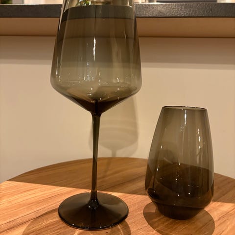 Magnor Glassverk Noir vinglass med en kapasitet på 63 cl. Settet inneholder 5 glass. Glassene har en mørk fargetone og er designet for servering av vin.