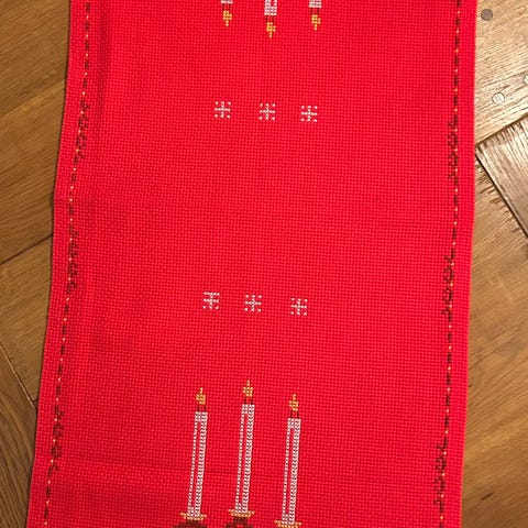 Håndlaget brodert løper i hardangersøm med hullmønster. Løperen har et dekorativt geometrisk design og passer til dekorasjon på bord eller møbler. Ingen flekker eller slitasje.