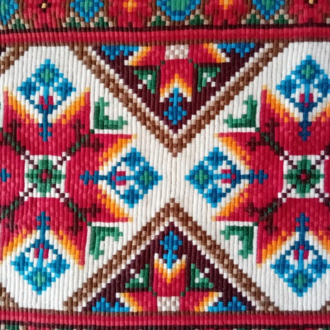 Håndlaget brodert løper i hardangersøm med hullmønster. Løperen har et dekorativt geometrisk design og passer til dekorasjon på bord eller møbler. Ingen flekker eller slitasje.