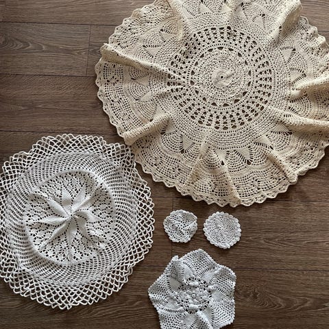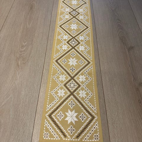 Håndlaget brodert løper i hardangersøm med hullmønster. Løperen har et dekorativt geometrisk design og passer til dekorasjon på bord eller møbler. Ingen flekker eller slitasje.