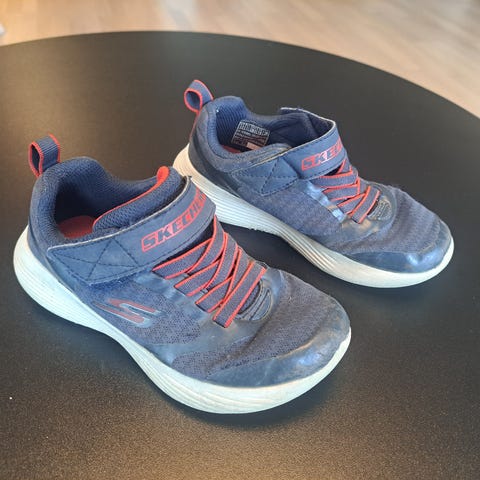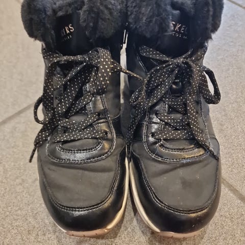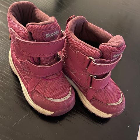 Skechers barn vintersko i størrelse 27, designet for jenter. Skoene har en lilla farge med mønster og er laget av materialer som er egnet for vintersesongen. De har borrelås for enkel justering og en solid såle for godt grep.