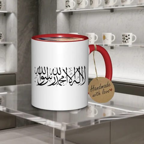 Shahada Arabisk Kalligrafi Keramikkrus - Islamsk Kunst Kaffe- og Tekopp med Svart Arabisk Logo, Oppvaskmaskin, Flere Bruksområder for Kontor - Elegant Muslimsk Gave til Helligdager (Rund, Arabisk Skriftdesign).