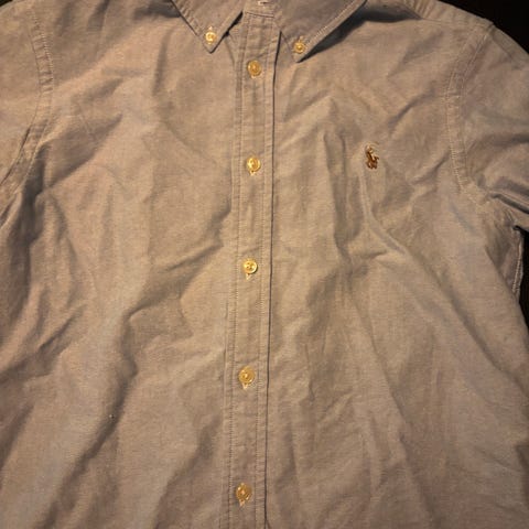 Selger en stilig Ralph Lauren-skjorte til gutt i str. 14 år. Skjorten har klassiske grønne og hvite striper og er laget i myk bomull, som gjør den både behagelig og slitesterk. Perfekt til både hverdag og litt finere anledninger.
