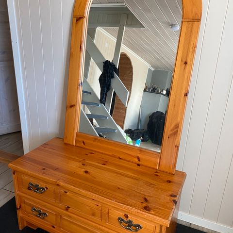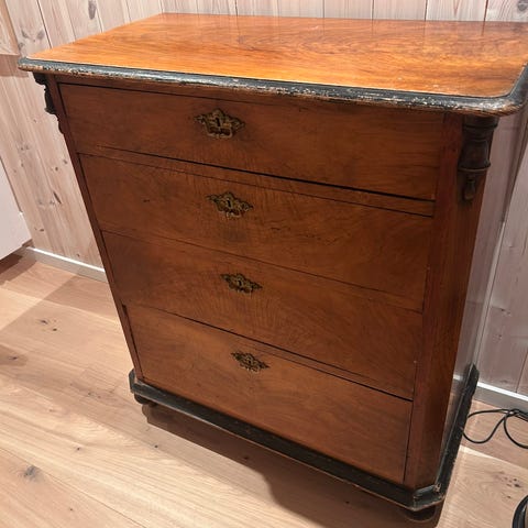 Pen kommode i heltre med utskjæringer nederst. Skuffene er lette å ta opp og igjen. Trenger et nytt malingsstrøk.