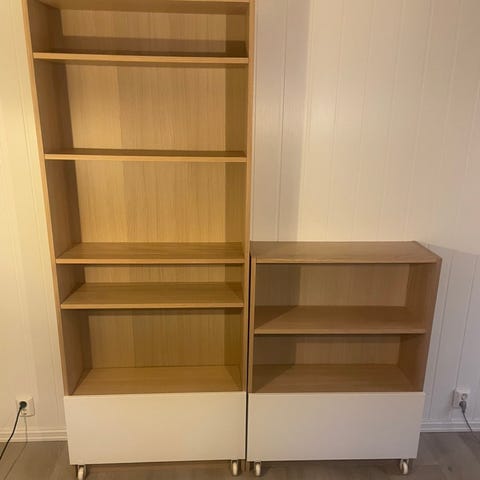 IKEA Eket oppbevaringshylle i grå farge med fire rom, selges for 150 kroner. IKEA Eket i lys blågrå med ett rom, selges for 75 kroner. Laget av tremateriale, egnet for organisering og oppbevaring i hjem eller kontor.