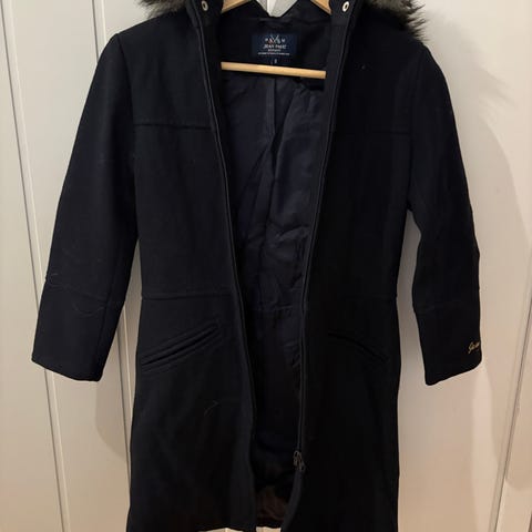 Jean Paul ullkåpe i størrelse 10 år. Kåpen er svart og har avtagbar hette med pelskant.