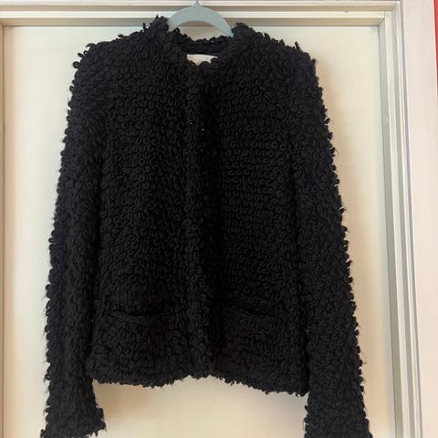 Selger denne lekre strikket jakken fra franske Iro. Den har lekre detaljer i strikken over hele og er i en fantastisk kvalitet som gjør den herlig å ha på. Fargen heter natur og passer til alt du måtte ha liggende i skapet! Den kan kles opp og ned og kan passe til flere anledninger. Den er i str. M, men i og med at den ikke har lukking så kan den passe både s og l også. Den er ikke stram i strikken over armene, men sitter likevel veldig fint. Ny pris på denne var 5000,- så her kan du gjøre en kjempe deal! Den har noen få nupper på ermene, men det er ikke veldig synlig og går vekk med nuppefjerner om du har det, se bilde for nupper