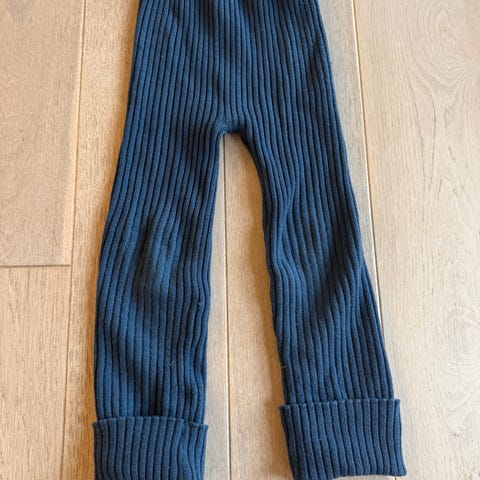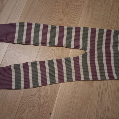 Nøstebarn er str. 110-122 (med brett, god i størrelsen) og er veldig pent brukt. Eneste merknader jeg kan se er en svak rosa prikk på ene kneet, og en liten slitasje på det andre kneet (ikke hull, men løsere masker).