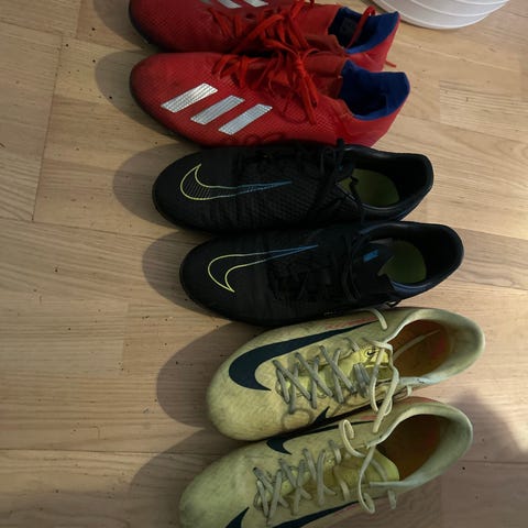 Nike og Adidas fotballsko i ulike størrelser og farger