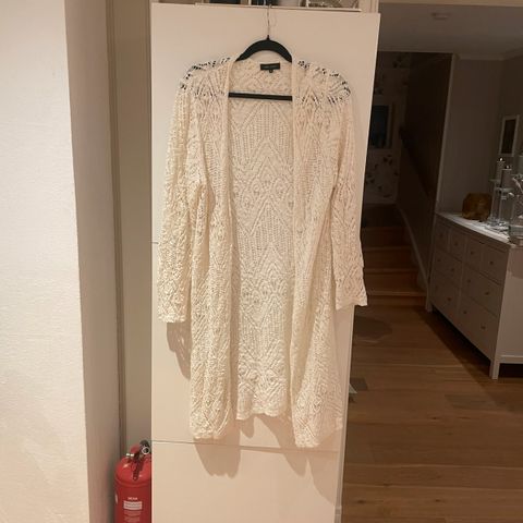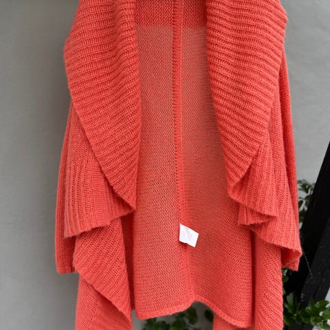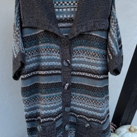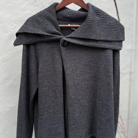 Turkis cardigan i strikk med bred faldekrage. Størrelse XL fra merket Milieu, passer nok også en Large. Litt sprekere farge enn på bildet.