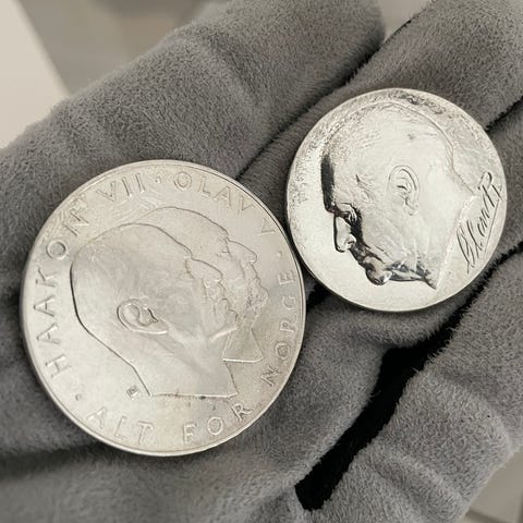 2 stykker Norges Konge i 25 År ,100 kroner, kv 0, sølv