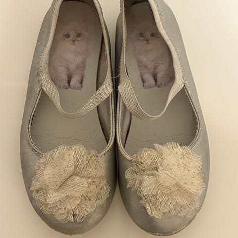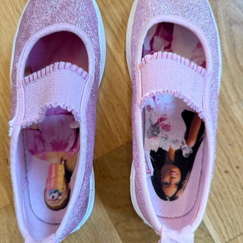 H&M ballerina sko for jente i størrelse 28. Skoene har en flerfarget glitrende overflate med stropp over vristen for bedre passform.