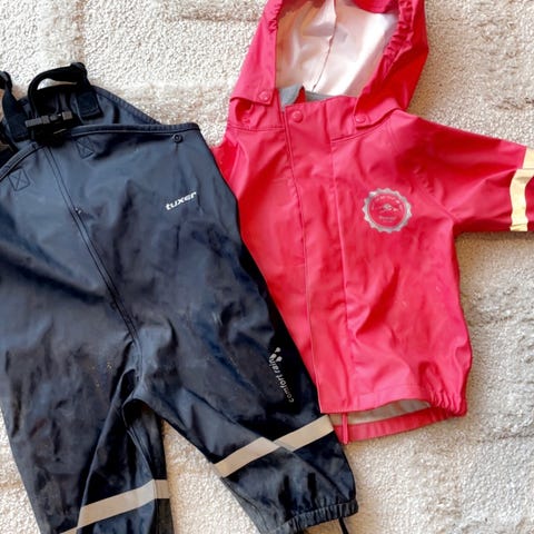 Selger Swedemount regnsett (jakke + bukse) i god stand. Blå jakke med hette og svart bukse, med refleksdetaljer for god synlighet. Nye strikker/elastikk