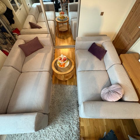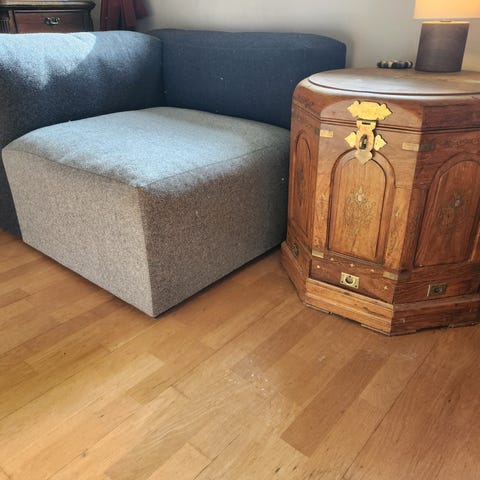Hay mags modulsofa i lys ullstoff. Sofaen er ca 12 år gammel og holder seg svært godt. Det er et lite område på divan-modulen der stoffet er slitt (se bilde). Låsepinner på en av modulene er litt slakke.