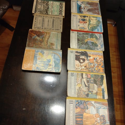 En bunke med 10 skolebøker fra 1800-tallet selges, helst samlet. Her er lesebøker for almueskolen fra 1850- årene, historie, matte fra 1877, litteraturhistorie fra 1879, stilbok, fremmedordbok fra 1863 etc. Rufsete stand, men dekorative og har sidene intakt såvidt jeg kan se. Ikke kjellerlukt. Kan sende.
