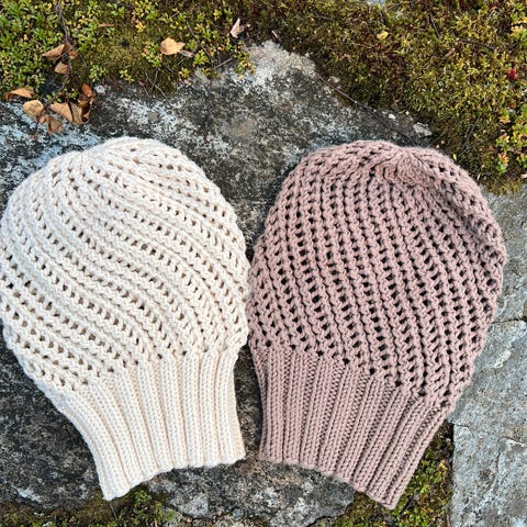 Selger en baggy lue med rullekant strikket i ullgarn.