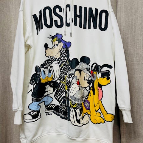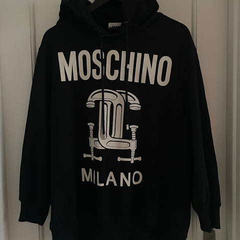Hvit Moschino hettegenser med bamsemotiv og volang detaljer. 164 cm, 14 år. Brukt en gang.