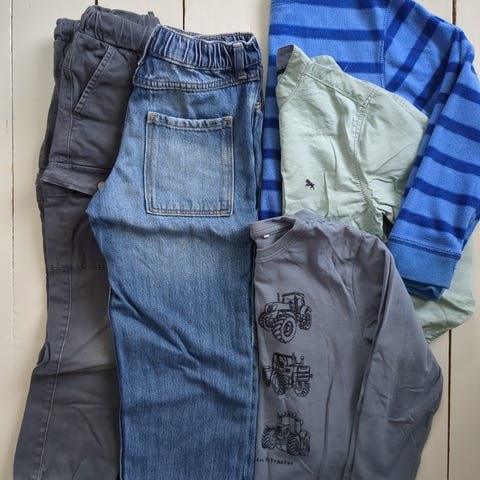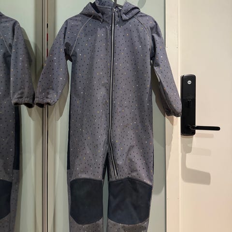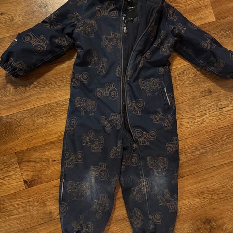 Name it softshell barn dress i størrelse 116 for gutt, laget av polyester. Dressen har blå farge med dyremønster og forsterkninger på knær og sete. Den har hette og glidelås i front.