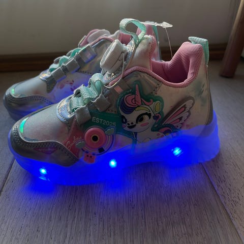 Fine blinkesko. Lades av en PC. Har forskjellige fargealternativer og moduser. Innersålen er 23,5-24 cm. Var brukt som innesko bare flere ganger. Ble raskt små.