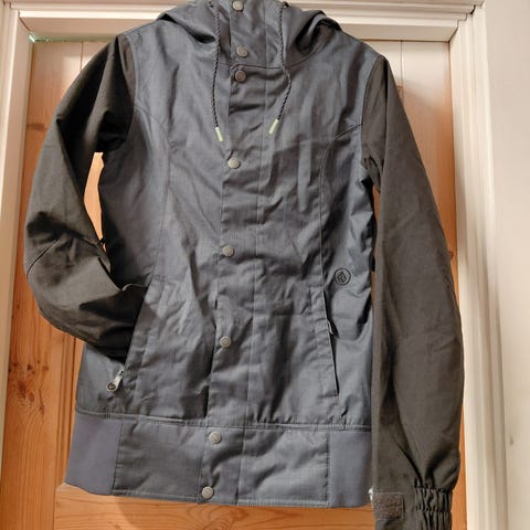 Volcom snowboardjakke i Gore-Tex materiale, størrelse S for dame. Jakken er grønn med svarte detaljer og har funksjonelle egenskaper som vanntetthet og pusteevne, egnet for utendørs bruk.