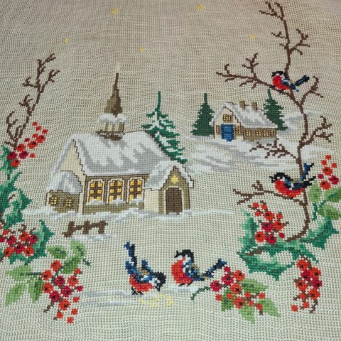 Nydelig liten brikke til jul i Hardangersøm. Noe er brodert med gullfarget tråd. Den er i veldig fin stand. 14x15 cm.