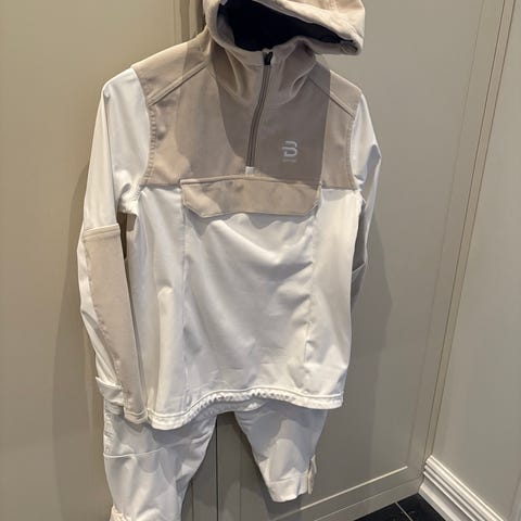 Dæhlie Sportsett for kvinner i størrelse S. Sett bestående av jakke og bukse med farger i beige, hvit, svart og oransje. Et lite merke ( se bilde ), kun brukt et par ganger.