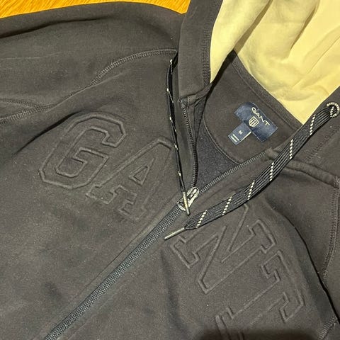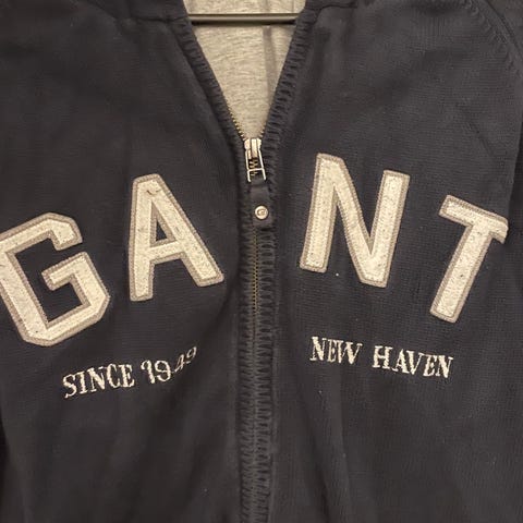 Gant hettegenser som ikke selges lenger i størrelse M. Genseren har blå farge med hvite detaljer og glidelås foran. Lite brukt og ser ny ut.