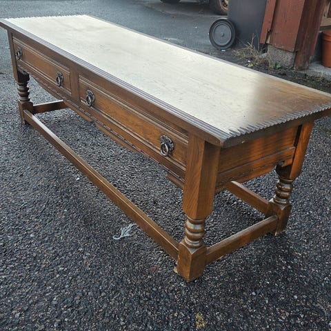 Meget solid salongbord selges. Farge mørkebrun. Har en skuff. Bordet er lakkert for ca 2,5 år siden.