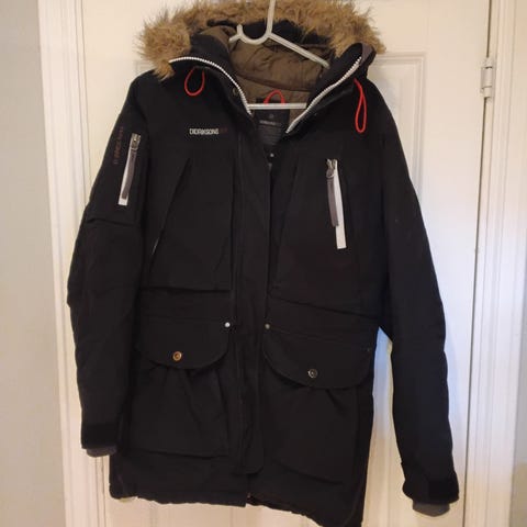 Didriksons Vinterjakke Helle model i størrelse 44 for kvinner. Jakken er grønn og laget av polyester. Designet for å gi varme og beskyttelse i vintervær.