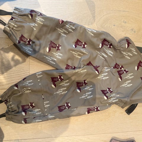Regnsett med jakke og bukse fra Kattnakken («plask»). Settet er i god stand, da det kun er brukt en håndfull ganger, før lillemor vokste ut av det.