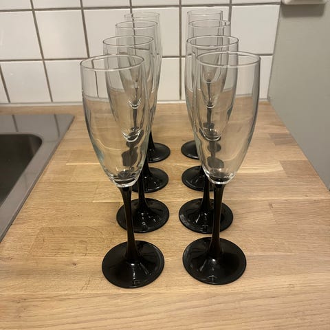1. Høyt, smalt glass (champagne?): H: 17 cm, Ø: 5 cm (12 stk) - selges for 50 kr pr stk - samlet for 550 kr.