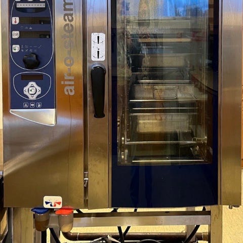 Rational elektrisk kombidamper med kapasitet for flere brett, laget i rustfritt stål. Utstyrt med digitalt kontrollpanel og glassdør for oversikt over innholdet. Passer til profesjonell bruk i kjøkkenmiljøer.selges med strøm og vanntilkobling, med bakebrett og vasketabeletter