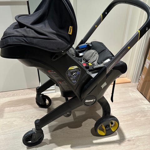 Myggnett, solskjerm, to regntrekk samt grå stellebag (festes på vogn fremme) og en veske som kan festes bak medfølger i prisen.