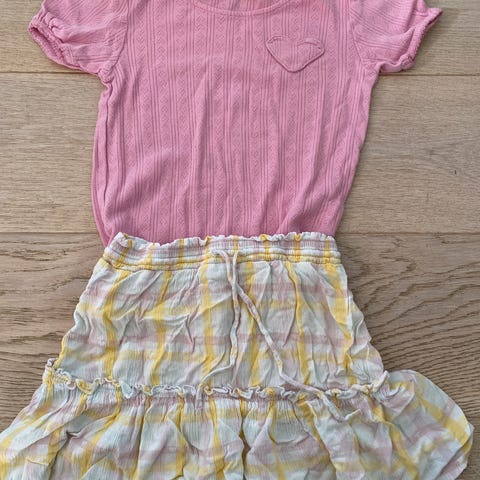 Jentetøy i str 116, stripete topp og ensfarget underdel i fargene hvit og gammelrosa. Fargene er gjengitt best i bilde 2 og 3. Kjøpt som gave, men ble glemt og nå for smått.