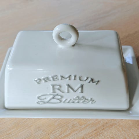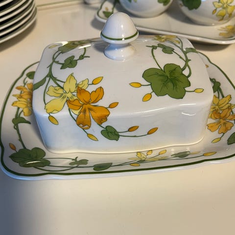 Denne vakre smørskålen fra Villeroy og Boch " French Garden " er utgått fra produksjon og vanskelig å få tak i. Høyde 10 cm, platen måler 20x15 cm. Meget pent brukt, minimale/ ingen bruksmerker, blank fin glasur.