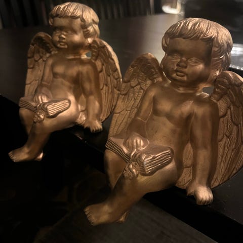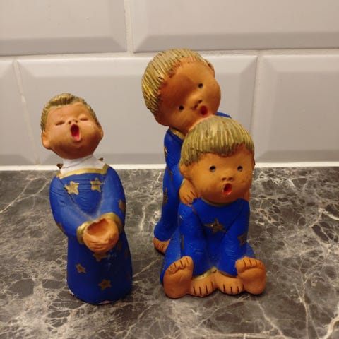 Fem fine engler i treverk. Ca 7cm høye. Pent brukt.