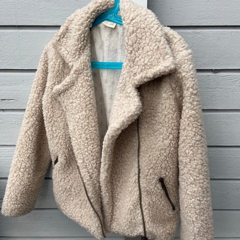 Jakken er beige/brun og laget av polyester. Den har et mykt, plysjaktig materiale og glidelåslukking foran. Jakken er egnet for barn og gir varme og komfort til litt penere bruk.