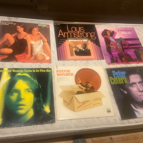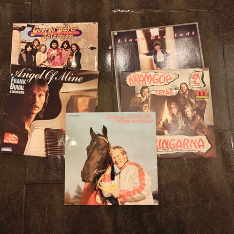 Bunt med forskjellige vinylplater i varierende tilstand. Inneholder flere album med ulik musikkstil og artister. Passer for samlere eller de som ønsker å utforske musikk på vinyl.