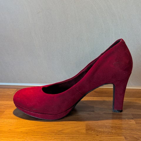 Marco Tozzi svarte pensko i semsket skinn. Hælhøyde er 9 cm.