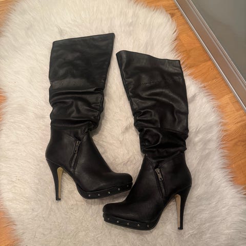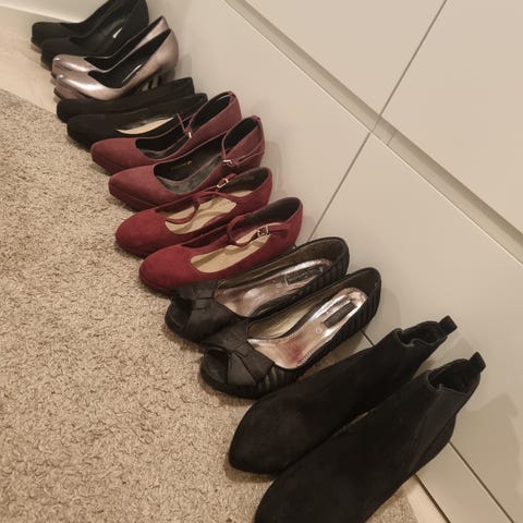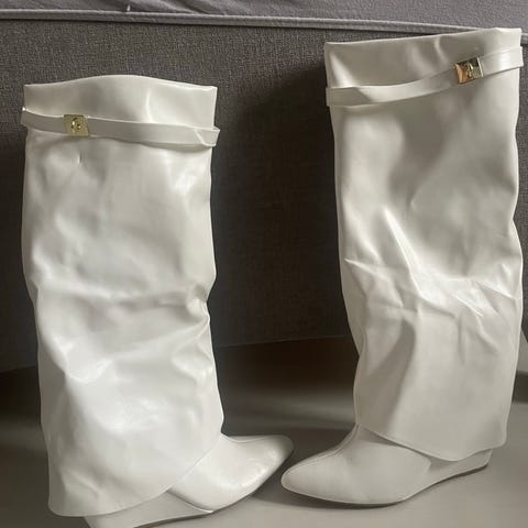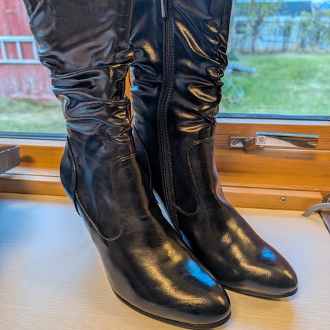 Disse selges da de brukes lite, pakkepris til 450 kr eller 200 kr pr stk. Slide 2-4: Grå ankelboots fra H&M i str 40. Slide 5-7: Svarte veganske plattform pumps fra Monki i str 41. Slide 8-10: Beige knehøye boots fra Pull & Bear i str 41.