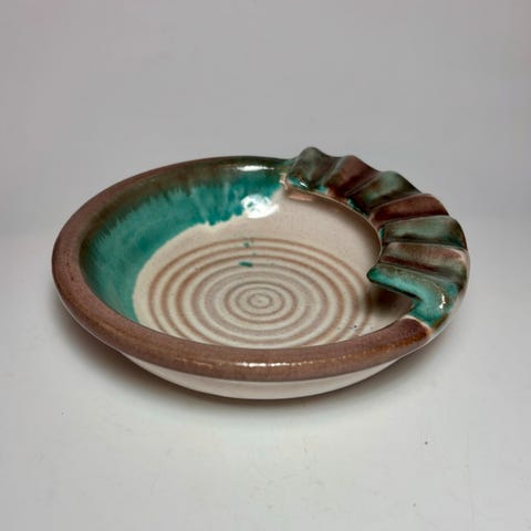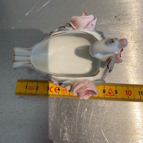 Skål formet som svane + pyntefigur, svane i farget glass. Ikke brukt.