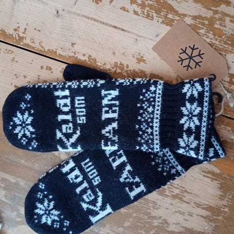 Håndstrikkede votter i størrelse L for unisex. Vottene har et mønster i rød og grå farge, og er laget i strikket ull materiale. Egnet for bruk ved kaldt vær. L 28x11cm.