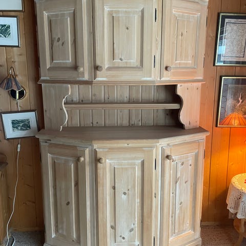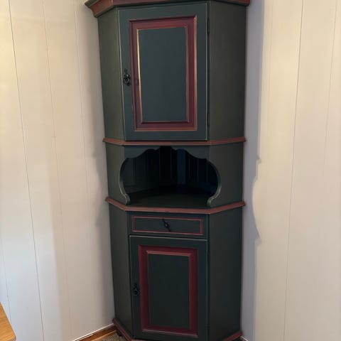 Antikkmalt framskap i kombinasjon av grønn og rustrødtoner. Skapet har hyller både i øvre og nedre del for oppbevaring. Pent brukt og solid kvalitetsmøbel. Passer til bruk som oppbevaringsmøbel i stue eller kjøkken.